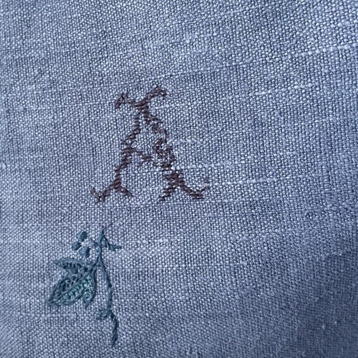 美しいインディゴ色のアンティークリネンには、ネイビーのクロスステッチでAの文字が刺繍されていました。